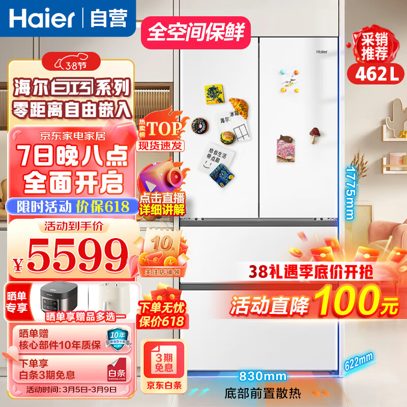 海尔(Haier)冰箱白巧系列462升风冷无霜变频白色法式多门冰箱零距离嵌入全空间保鲜母婴三挡变温黑金净化价格:5599.00元!