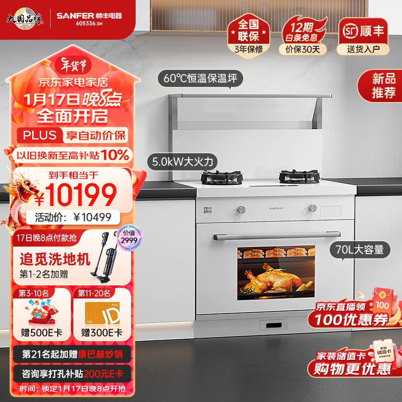帅丰(SANFER)TJ2-7B-90集成灶蒸烤一体集成灶 蒸箱 烤箱 蒸烤箱 集成一体吸油烟机燃气灶 白色价格:10599.00元!