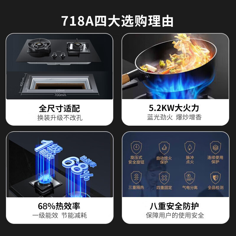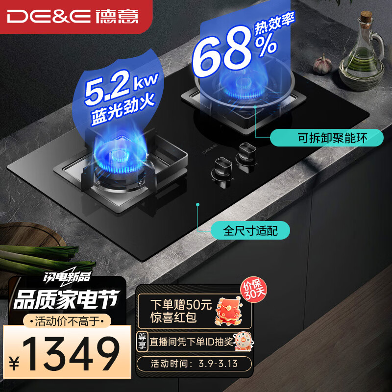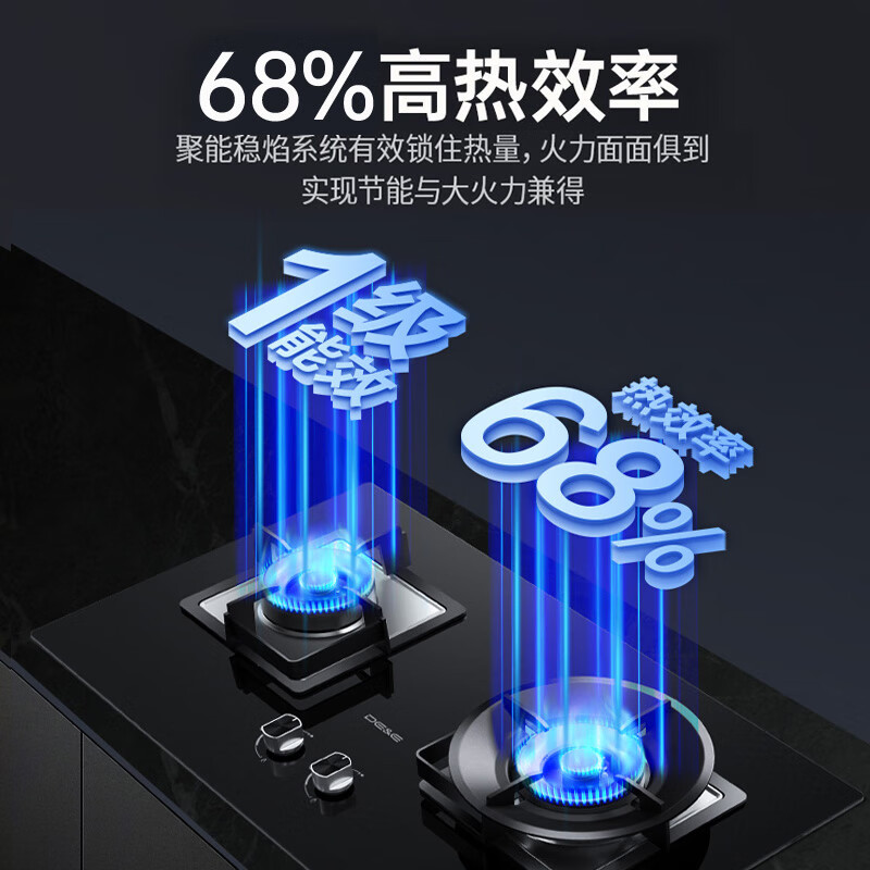 德意(DE&E)燃气灶 天然气 钢化玻璃燃气灶 全尺寸适配 灶具 5.2kW大火力68%热效率 聚能猛火灶台熄火保护718A价格:1399.00元!