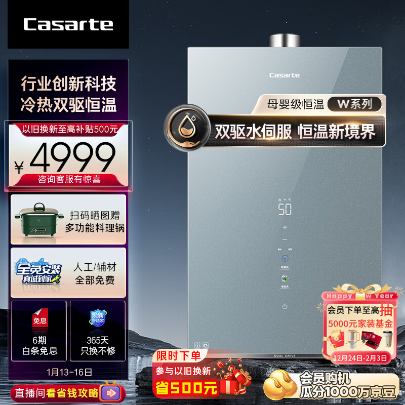 卡萨帝(Casarte)16升家用恒温燃气热水器天然气 双驱水伺服 静音强排式 下置风机 彩晶面板 JSQ31-16CWV3FVXGU1价格:4999.00元!
