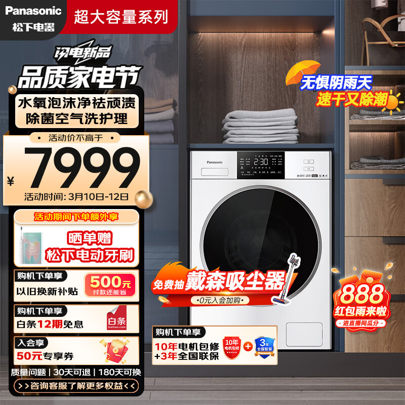 松下(Panasonic)滚筒洗衣机全自动洗烘一体12公斤大容量 全屋洗 水氧泡沫净 除菌空气洗 1.1高洗净比 XQG120-6NW05价格:8499.00元!