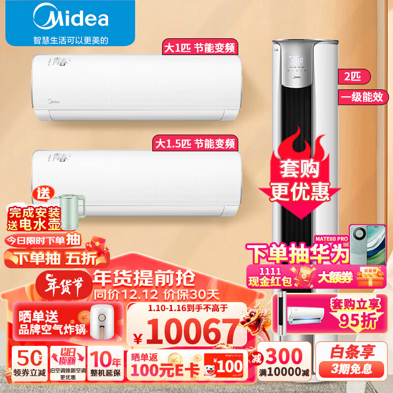 美的(Midea)空调套装两室一厅一套购齐 新一级能效变频挂机柜机 立式空调客厅 以旧换新 2匹风锦+i青春价格:10067.00元!