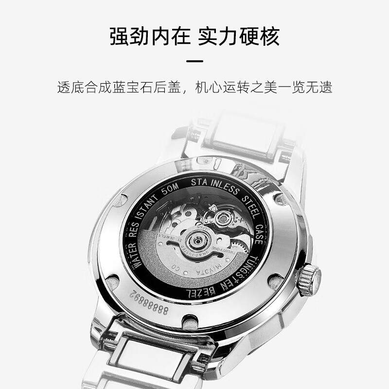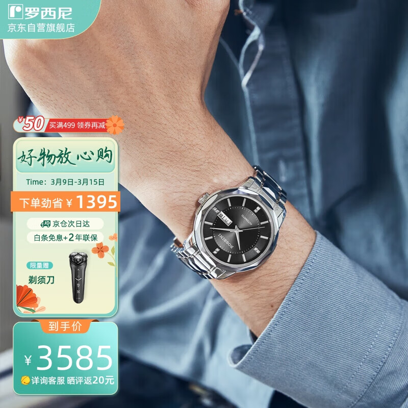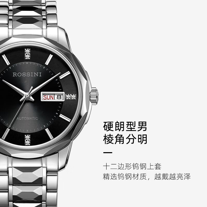 罗西尼(ROSSINI)手表男自动机械表黑盘钨钢带生日礼物送男友国表防水带日历 6889价格:3939.10元!