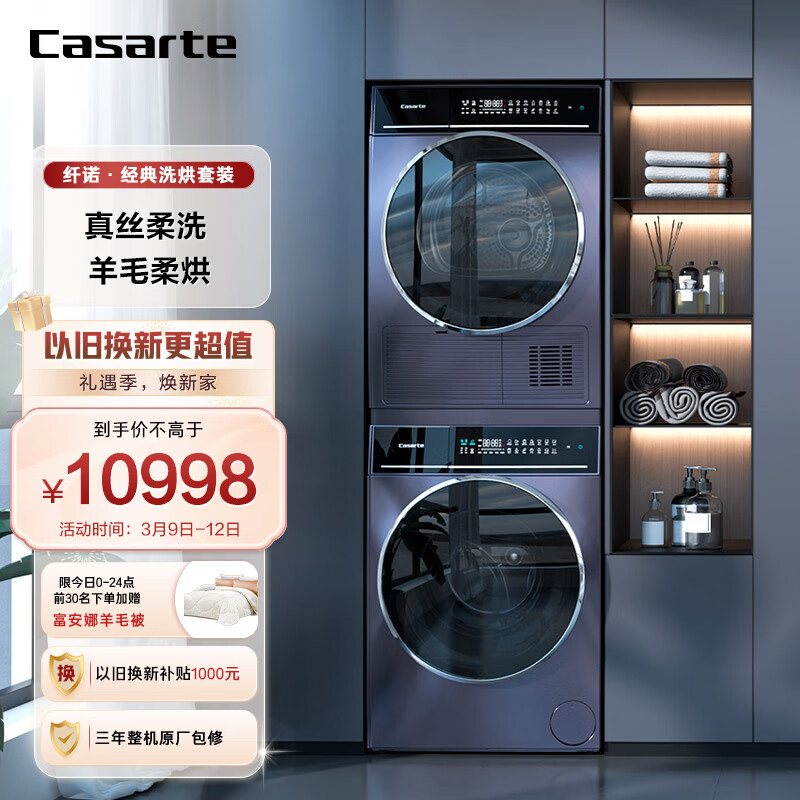 卡萨帝(Casarte)纤诺经典洗烘套装 直驱滚筒洗衣机全自动+热泵烘干机 丝绸羊毛烘 以旧换新 C1 10P3U1+CG 10FP3U1价格:10998.00元!