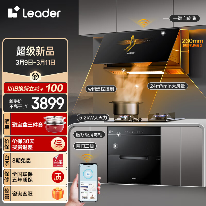 Leader海尔智家出品 超薄近吸烟灶消三件套 24m3/min大吸力 家用油烟机灶具C2U1+GL2C天+E07JU1价格:3899.00元!