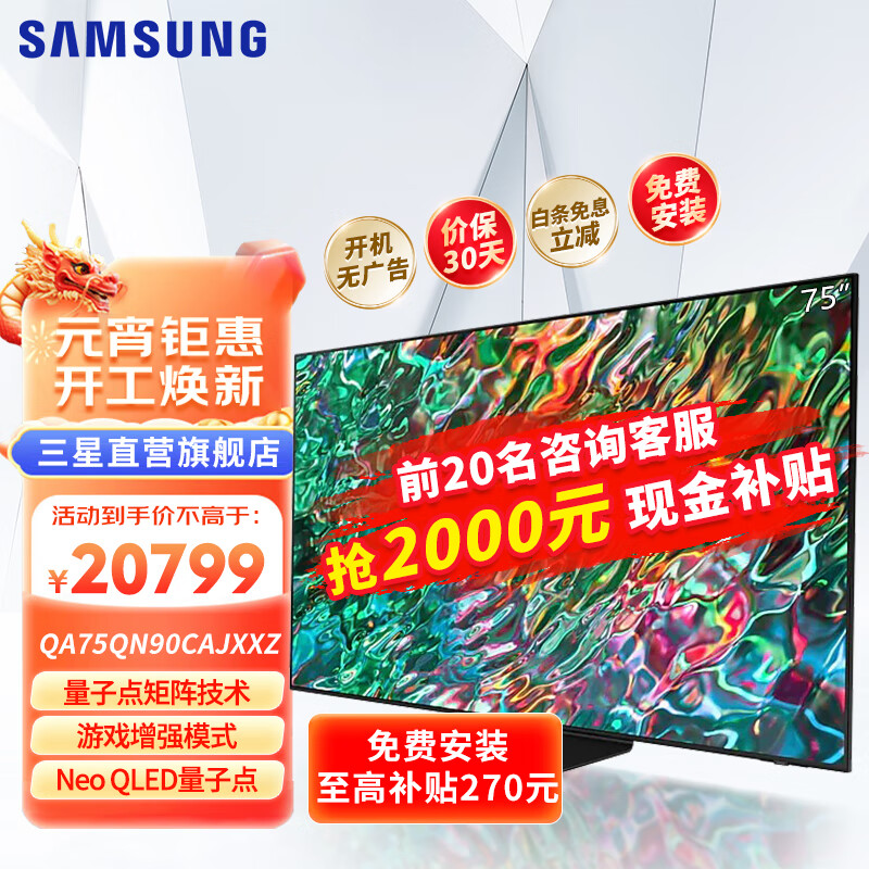 三星(SAMSUNG)三星(SAMSUNG)QN90C 75英寸 4K超高清Neo QLED量子点矩阵 超薄精准控光电视机QA75QN90CAJXXZ价格:20799.00元!