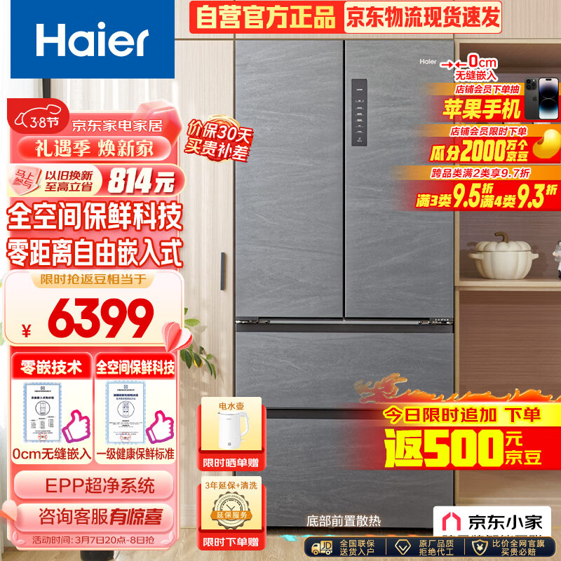 海尔(Haier)501升全空间保鲜零嵌法式四开多门嵌入式电冰箱家用一级超薄以旧换新510旗舰款BCD-501WGHFD14S8U1价格:7099.00元!