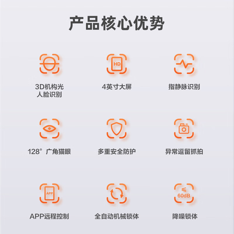 附加功能:防小黑盒,试错报警,徘徊抓拍,离家联动模式,按门铃抓拍,虚位密码,防试开报警,防撬报警,防劫持报警,防盗模式,电池更换提醒,实时抓拍,可视对讲