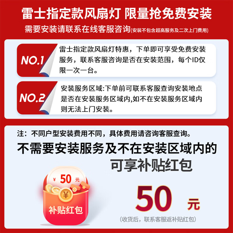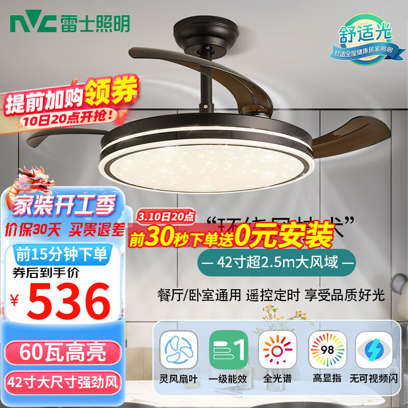 雷士(NVC)吊扇灯风扇灯客厅餐厅简约全光谱高亮三色光1级能效变频42寸60瓦价格:809.00元!