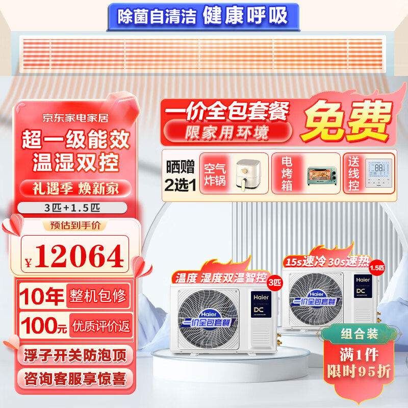 海尔(Haier)中央空调风管机一拖一 组合套餐3匹+1.5匹新一级能效 云舒 全直流变频 KFRd-72NW/72ECD81价格:12699.00元!