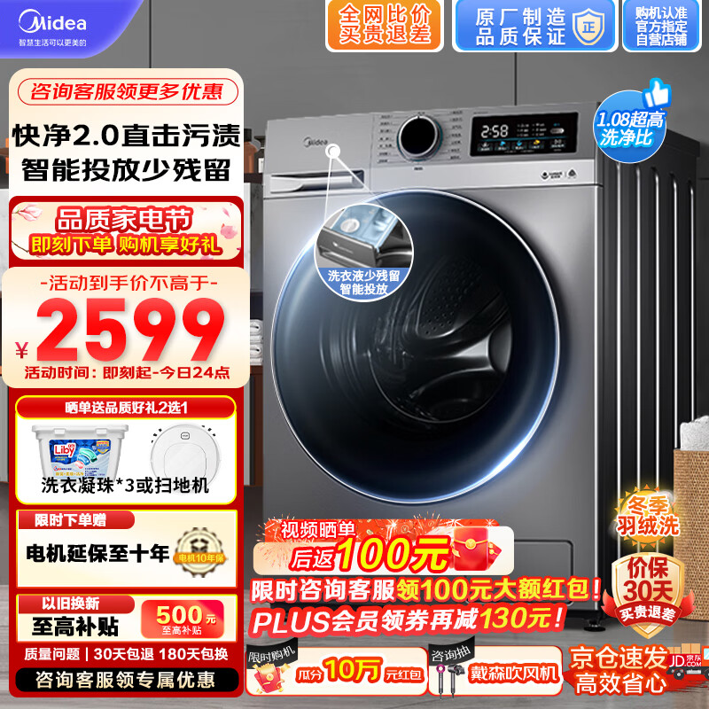 美的(Midea)滚筒洗衣机全自动10公斤家用大容量变频超薄滚筒 除菌除螨洗烘一体智能投放 以旧换新MD100Q35IY价格:2599.00元!