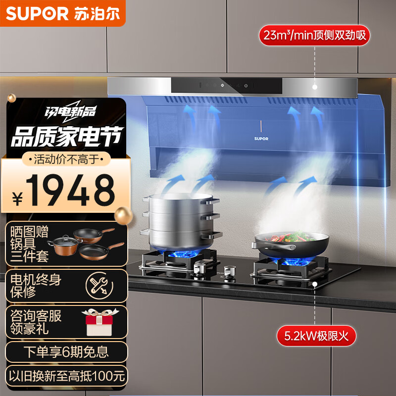 苏泊尔(SUPOR)抽油烟机 顶侧双吸7字型烟灶套装23立方挥手免拆洗家用烟机燃气灶具套装DL11+DB27液价格:1948.00元!