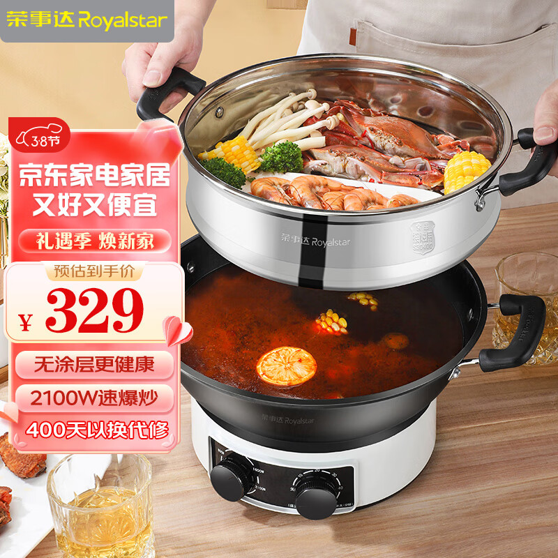 荣事达(Royalstar)电炒锅家用多功能蒸包子锅32CM山东锅电锅电炒锅电煮锅电火锅电蒸锅RDG-T32CG单笼价格:329.00元!