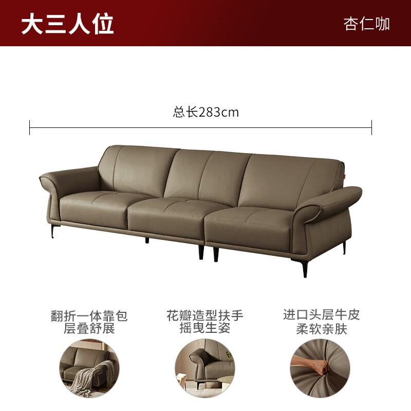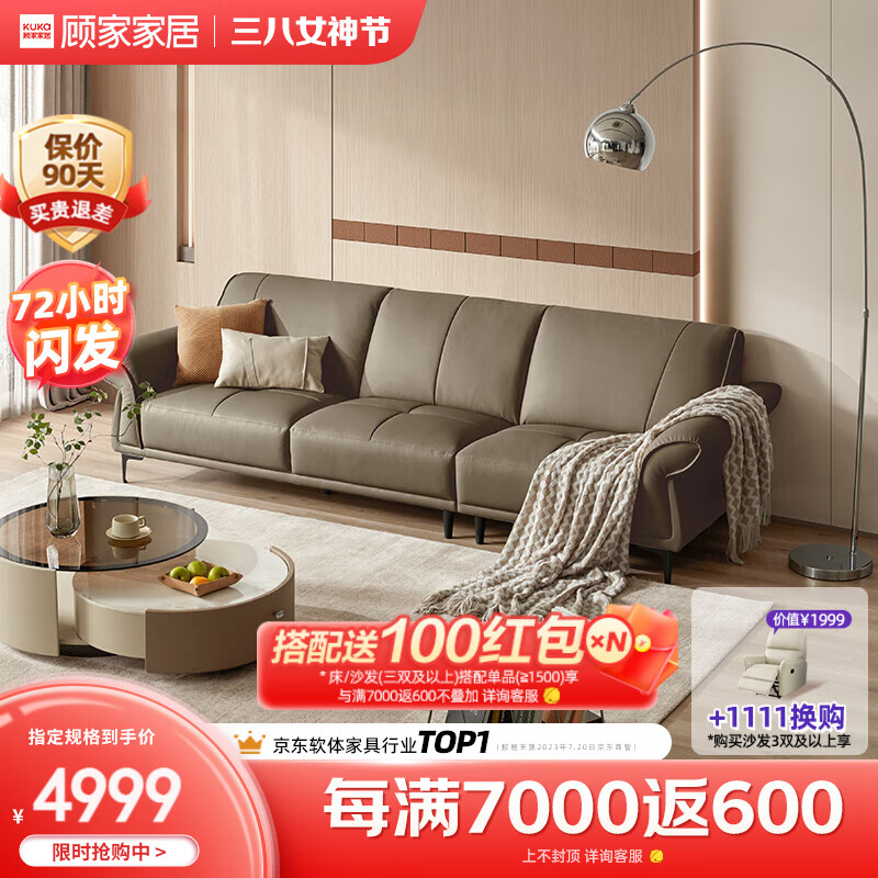 顾家家居(KUKA)现代简约头层牛皮沙发客厅沙发小户型1197【杏仁咖】大三人位价格:4999.00元!