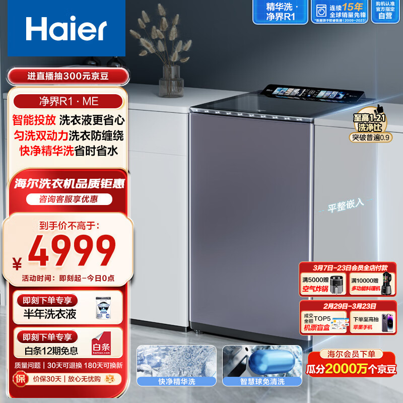 海尔(Haier)波轮洗衣机全自动【净界R1 】10公斤 后控平嵌 精华洗 双动力防缠绕 免清洗防桶垢MS100-BZ568H价格:4999.00元!