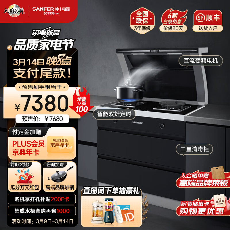 帅丰(SANFER)JJZT-J5-3B 集成灶消毒柜集成灶 油烟机 集成一体燃气灶 侧吸大吸力 天然气价格:7680.00元!