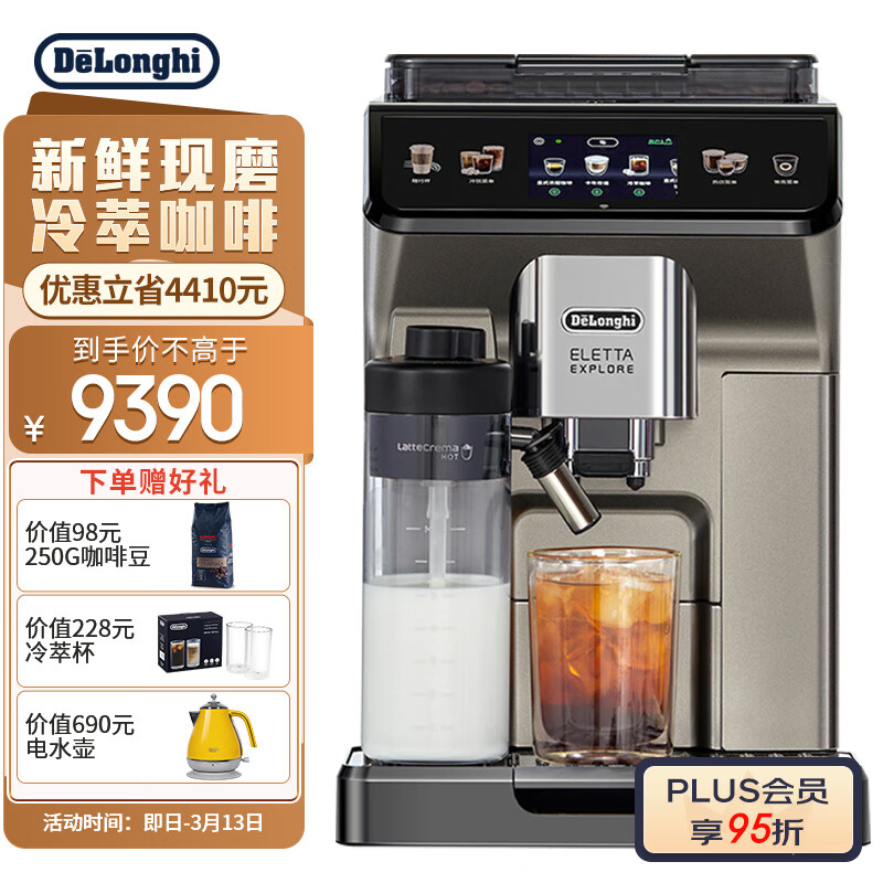 德龙(Delonghi)咖啡机 冷萃版探索者 全自动咖啡机 家用 原装进口 智能互联 触控操作 ECAM450.86.T价格:9390.00元!