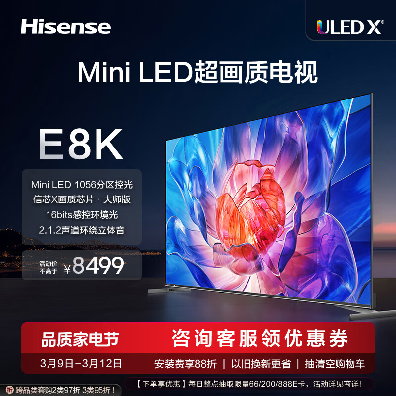 海信电视75E8K 75英寸 ULED X Mini LED 1056分区控光 4K 144Hz屏 液晶智能平板电视机 以旧换新价格:8499.00元!