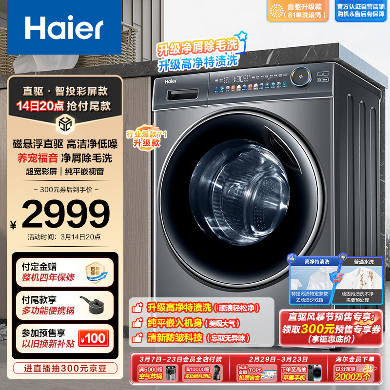 海尔(Haier)滚筒洗衣机全自动 10公斤大容量 纯平嵌入 智能投放 晶彩屏直驱变频 便捷一键智洗 EG100MATE81SU1价格:3269.00元!