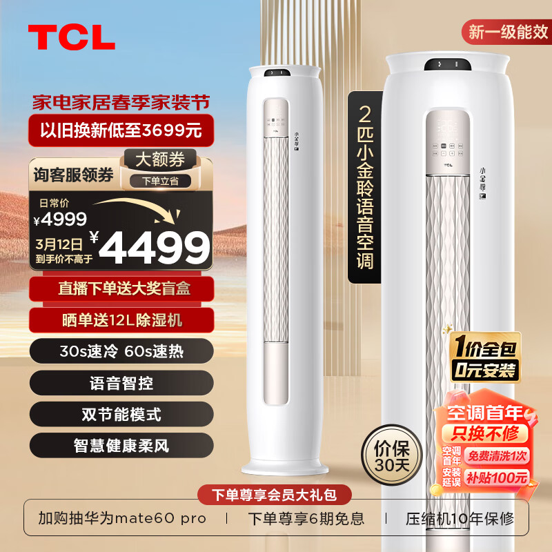 TCL空调2匹新一级能效变频冷暖 小金聆 语音智能 空调立式 空调柜机KFR-51LW/RT7Ga+B1一价全包价格:4499.00元!