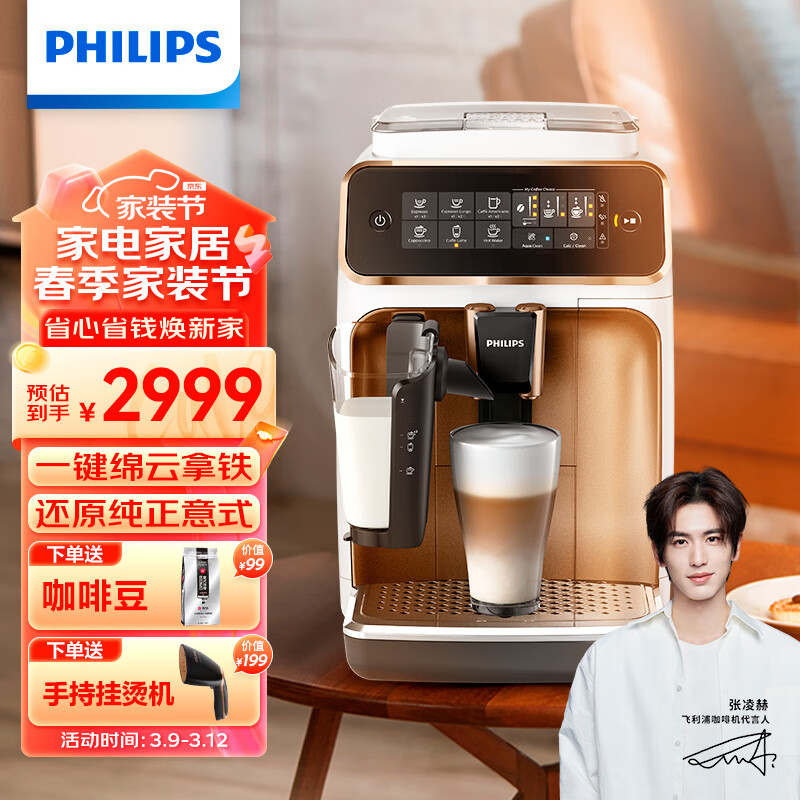 飞利浦(PHILIPS)云朵咖啡机3系EP3146/92 家用/办公室意式浓缩萃取全自动研磨一体机奶泡现磨咖啡豆系统价格:2999.00元!