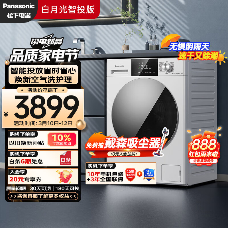 松下(Panasonic)滚筒洗衣机全自动 超薄全嵌【白月光智投版】10公斤 洗烘一体 智能投放 温水泡沫净 XQG100-810DF价格:3899.00元!