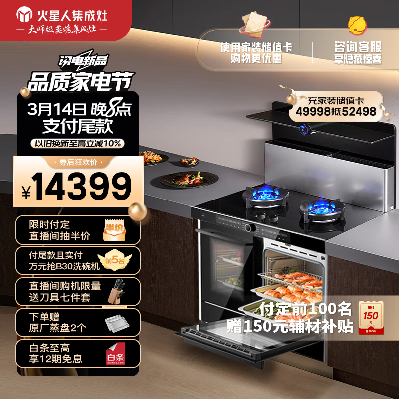 火星人集成灶T70BCZ蒸烤独立集成灶 智能蒸烤炸 家用蒸箱烤箱 燃气灶 天然气价格:14499.00元!