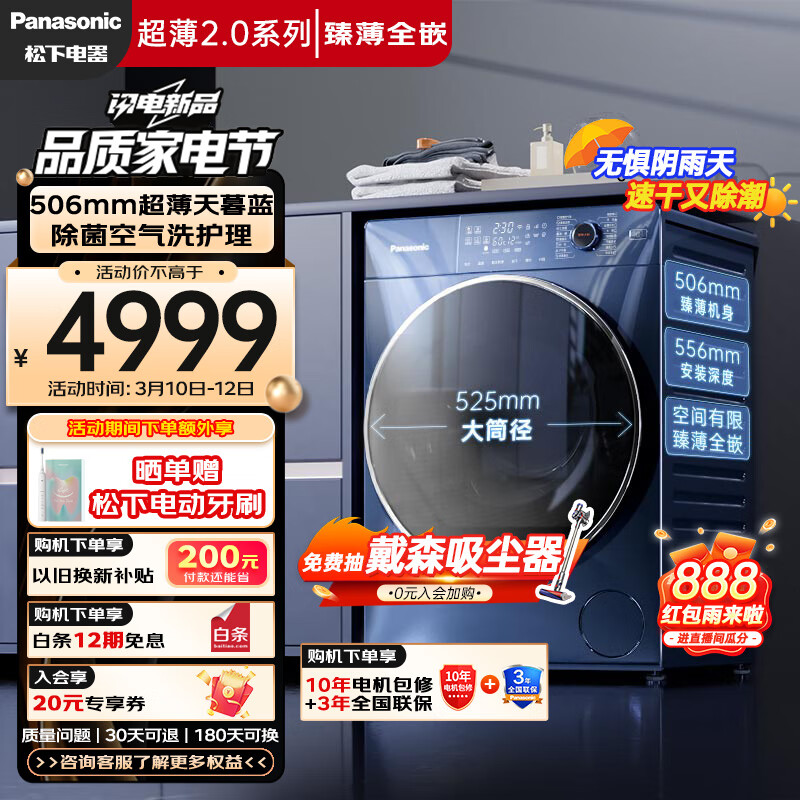 松下(Panasonic)滚筒洗衣机全自动 506mm超薄2.0【臻薄旗舰版】10公斤 洗烘一体 天暮蓝 水氧泡沫净XQG100-SD151价格:4999.00元!