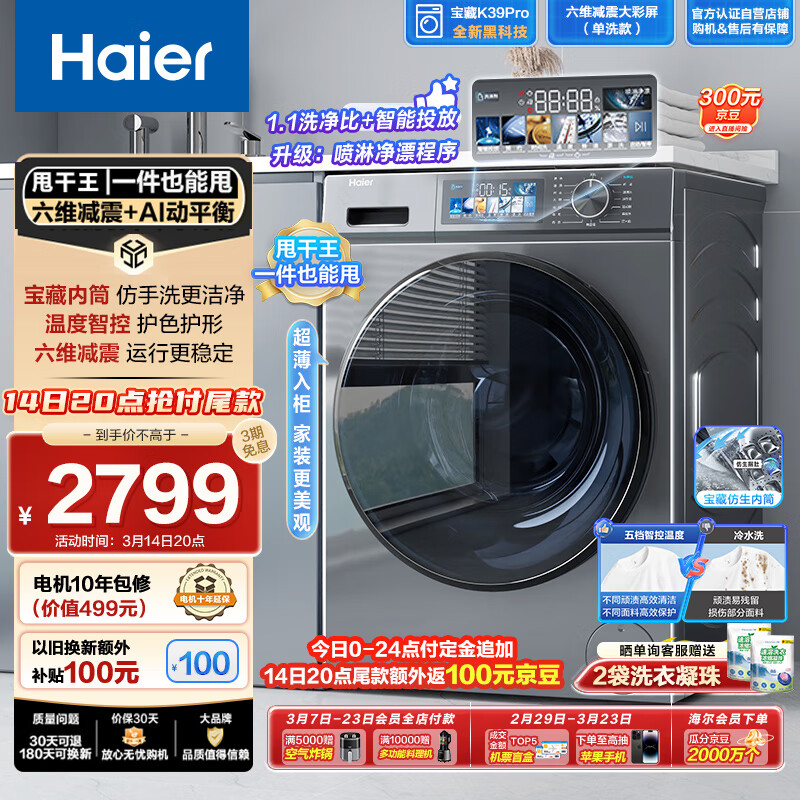 海尔(Haier)滚筒洗衣机全自动 宝藏K39Pro 10公斤大容量 一件也能甩 宝藏内筒 超薄彩屏 以旧换新 EG10065S价格:2799.00元!