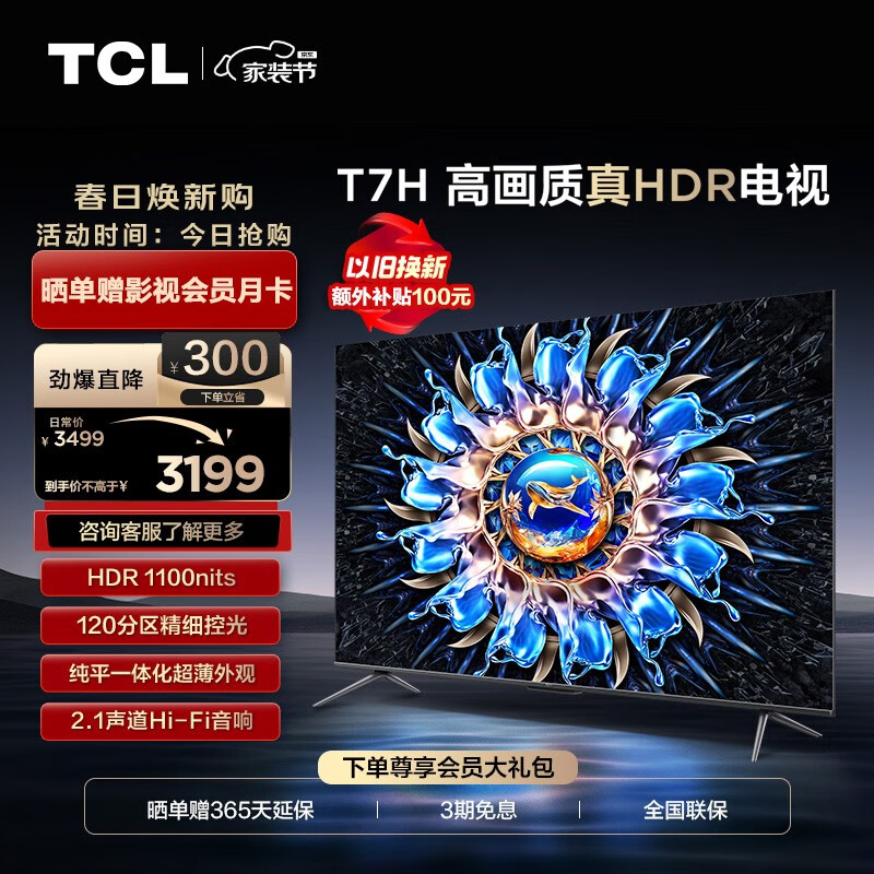 TCL电视 55T7H 55英寸 HDR 1100nits 120分区 4K 144Hz 2.1声道音响 客厅液晶智能平板游戏电视机价格:3099.00元!