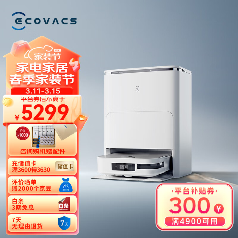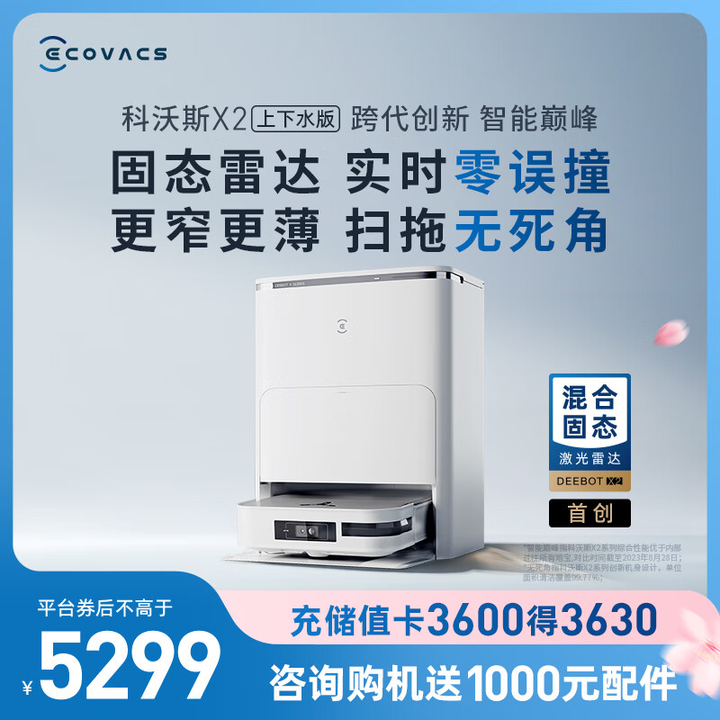 科沃斯(ECOVACS)X2上下水版扫地机器人智能家用扫拖一体自动清洗自动集尘热水洗抹布上下水-皓月白DEX86-12EA价格:5599.00元!