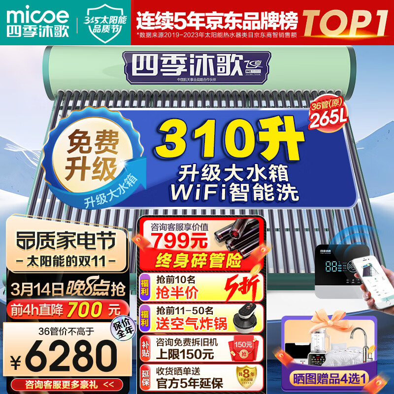 四季沐歌(MICOE)飞享WiFi太阳能热水器家用光电两用自动上水 预约电加热 水温水位显示 一级能效 上门安装36管265L价格:6980.00元!