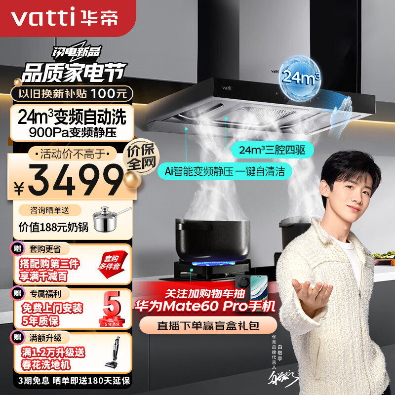 华帝(VATTI)抽油烟机家用顶侧欧式变频大吸力烟机燃气灶烟灶套装24风量自动清洗吸油烟机灶具套装i11206液化气价格:3499.00元!
