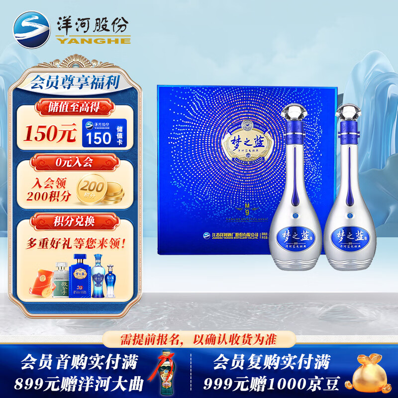 洋河 梦之蓝M9 52度 500ml*2瓶 礼盒装 绵柔浓香型白酒价格:3748.00元!