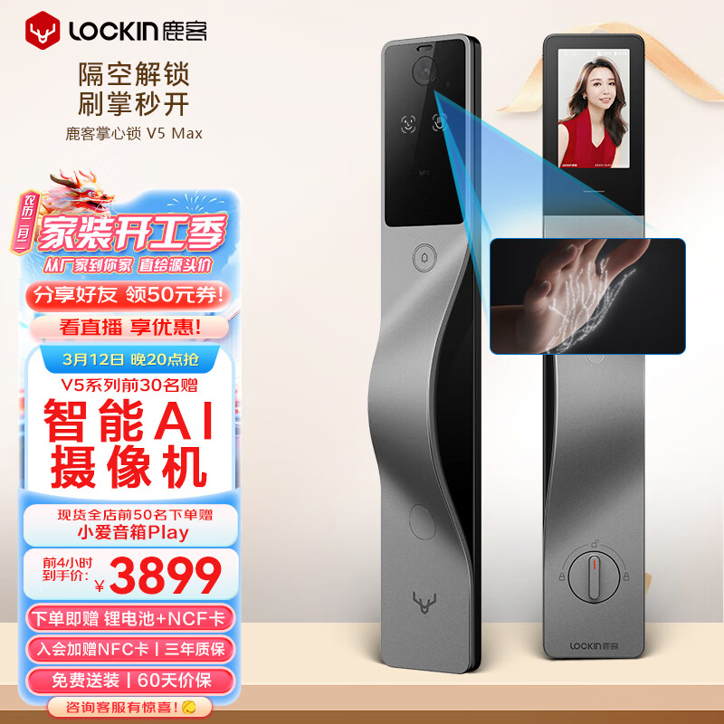 鹿客(lockin)掌心锁V5 Max掌静脉人脸识别猫眼屏电子锁APP智联适用右开价格:4299.00元!