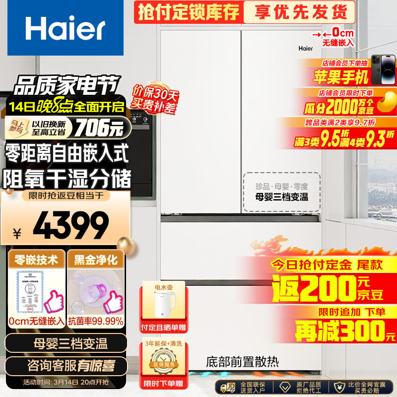 海尔(Haier)460L零距离自由嵌入多门四开门法式电冰箱家用白色一级能效超薄嵌入式以旧换新BCD-460WGHFD4DW9U1价格:5099.00元!