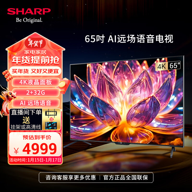 SHARP夏普4T-Z65B7FA 65吋 2+32G内存4K超高清 杜比音效 一键投屏 AI智能声控 屏液晶电视价格:4999.00元!