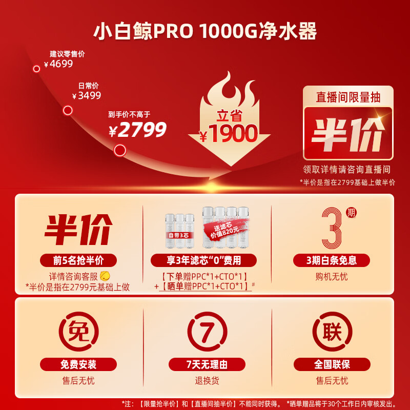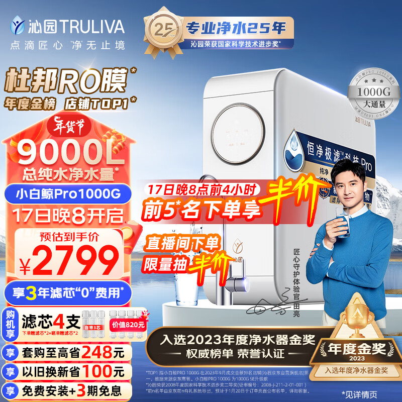 沁园(TRULIVA)小白鲸PRO大通量1000G家用净水器5年RO反渗透厨下直饮3L/分钟水 UR-S51046i价格:2999.00元!