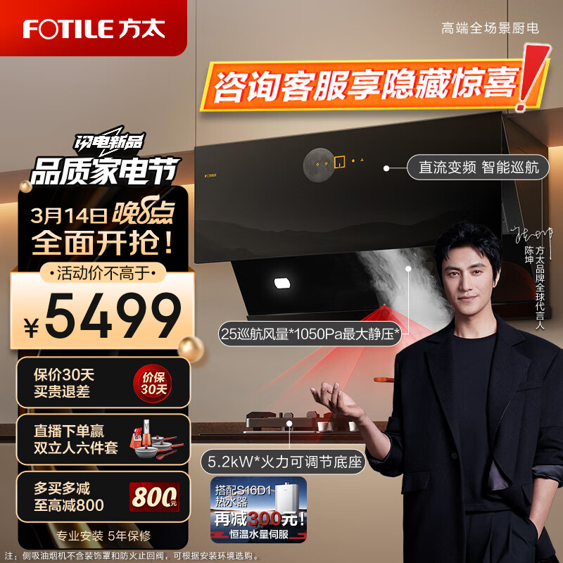 方太(FOTILE)抽吸油烟机灶具套装 侧吸式变频烟灶套装双智能巡航 25风量5.2kW猛火双灶JCD11T+02-TH27B天然气价格:5499.00元!