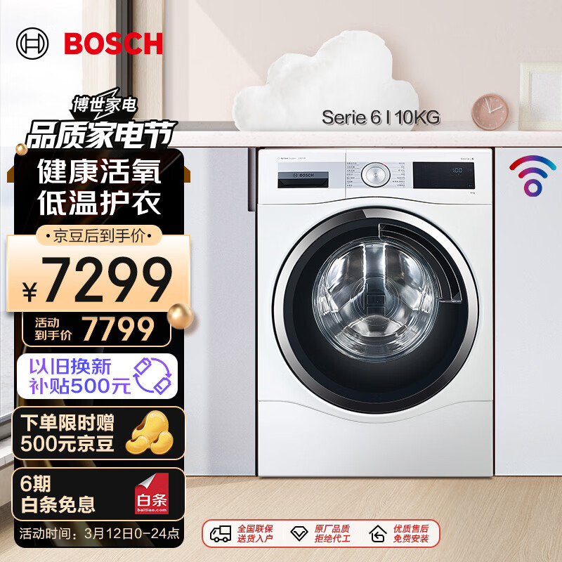 博世(BOSCH)【云朵白·活氧版】6系10KG全自动家用大容量1400转高效智能除菌除螨祛味滚筒洗衣机WGC354B01W价格:7799.00元!