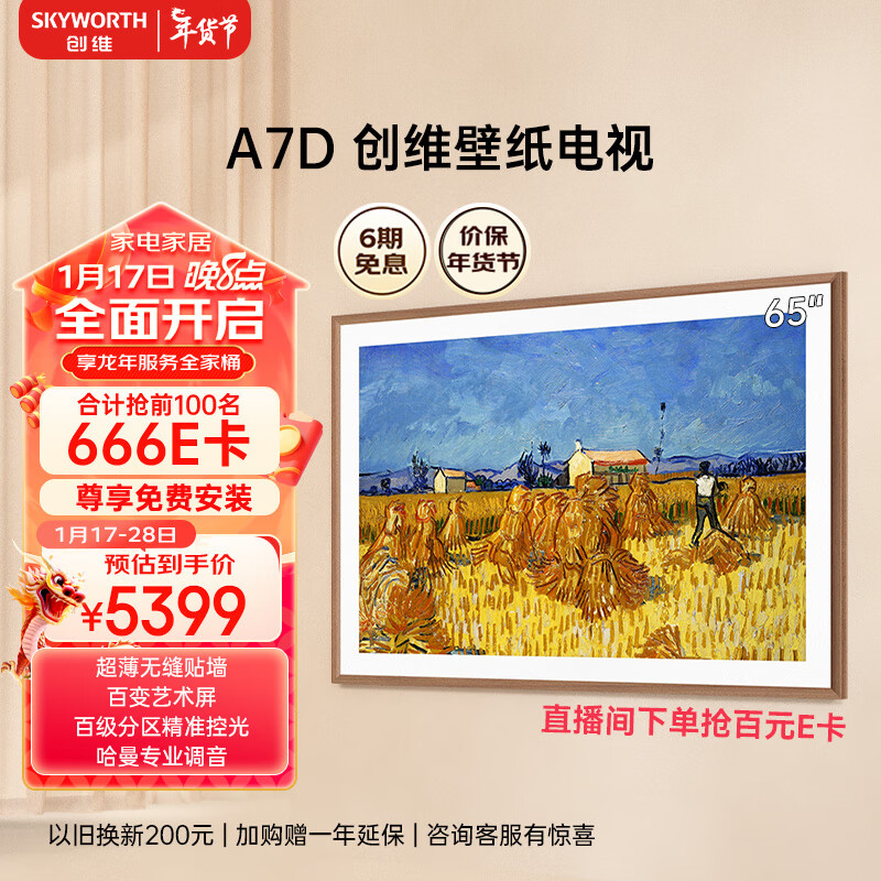 创维壁纸电视65A7D 65英寸 龙年定制超薄壁画艺术电视机 无缝贴墙百变艺术屏 4K超高清护眼液晶电视价格:5599.00元!