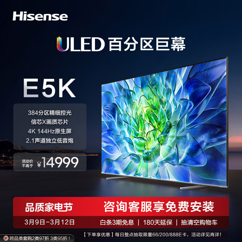 海信电视100E5K 100英寸ULED 384分区 4+128GB 4K 144Hz智能液晶平板电视机 以旧换新 98英寸+价格:14999.00元!