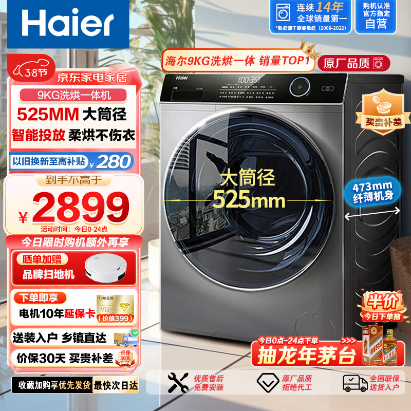 海尔(Haier)9KG家用全自动变频滚筒洗衣机 洗烘一体带烘干超薄洗衣机 双喷淋智能投放除菌洗衣机以旧换新价格:2899.00元!