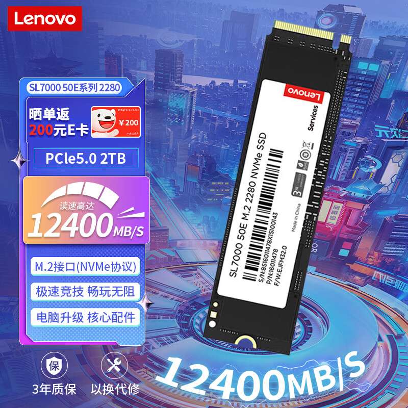 联想(Lenovo)2TB SSD固态硬盘 M.2接口(NVMe协议)四通道PCIe5.0 读速12400MB/s SL7000 50E系列价格:2459.00元!