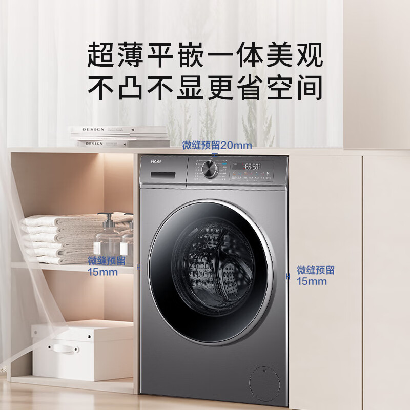 3、海尔(Haier)滚筒洗衣机10KG性价比超高的一款,美观轻薄,使用起来也很顺手,常用功能都有了。纤薄的身材,嵌入效果更佳,占地小。脱水时整机震动几乎没有,噪音非常小,洗涤效果佳。特别推荐购买。