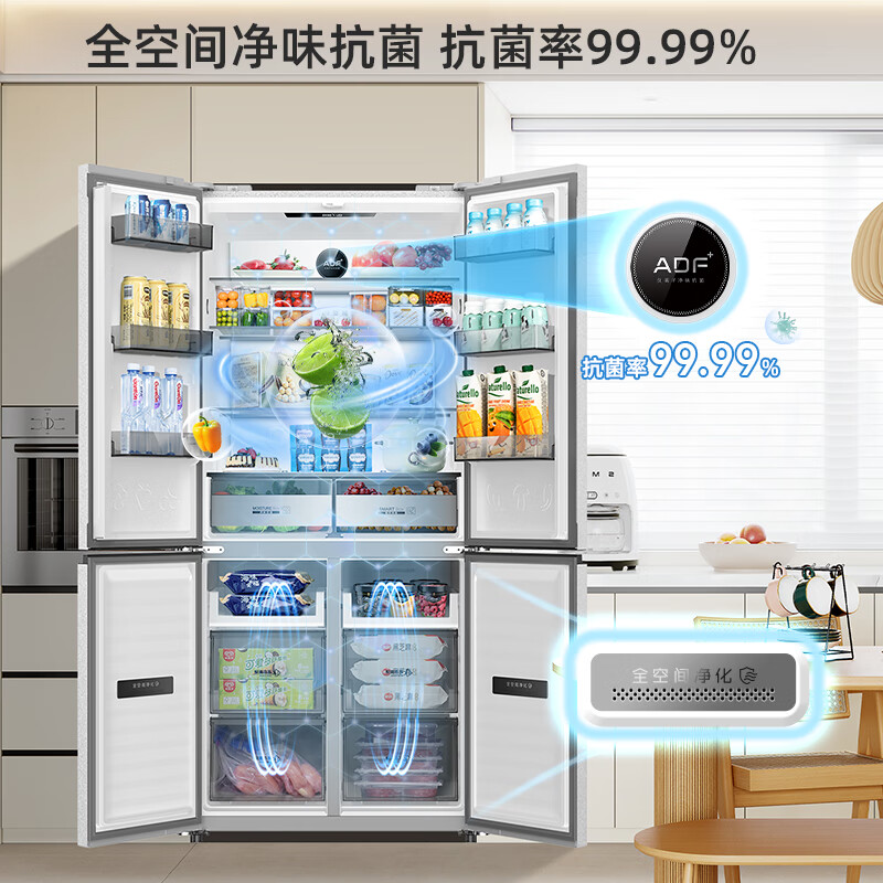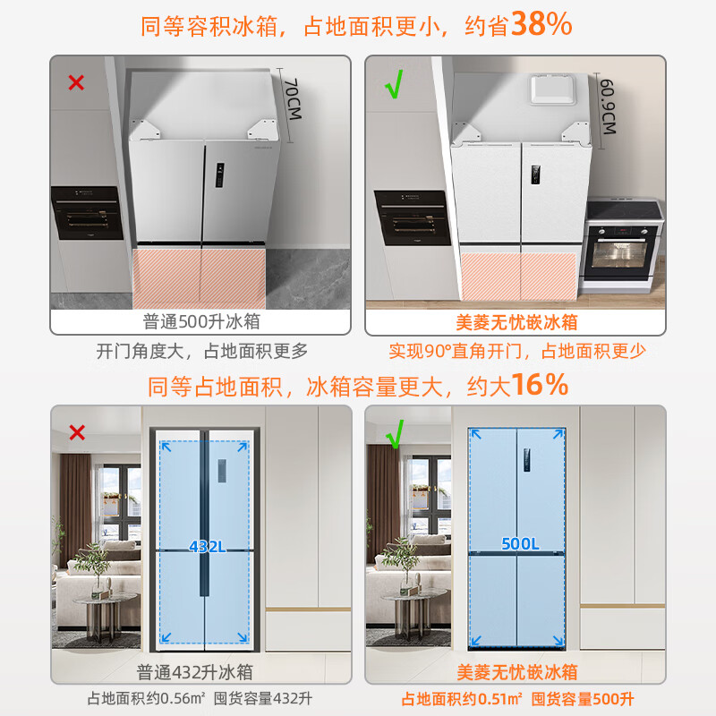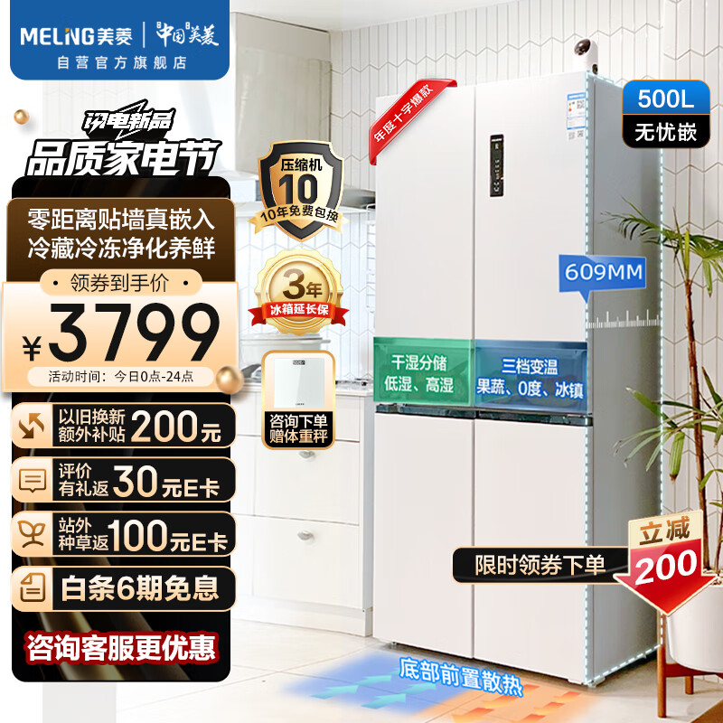 美菱(MeiLing)【无忧嵌】500升十字对开四开门超薄可嵌入式冰箱家用变频一级能效大容量底部散热BCD-500WPU9CX价格:3999.00元!