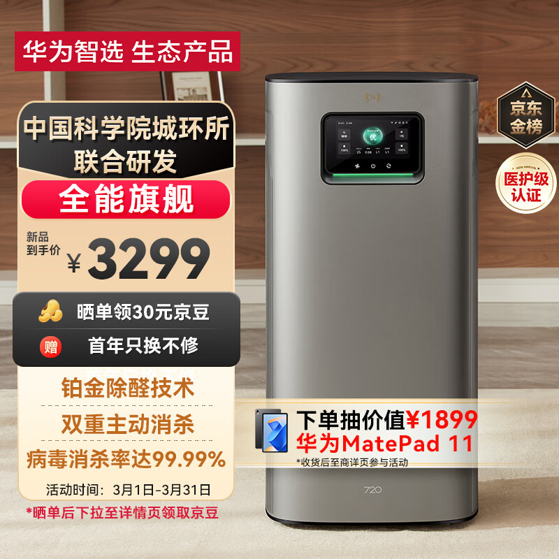 华为智选720智能空气净化器3Pro 铂金除醛 大空间疾速净化 除甲醛除苯异味吸附猫毛 主动消杀 鸿蒙智联价格:3299.00元!
