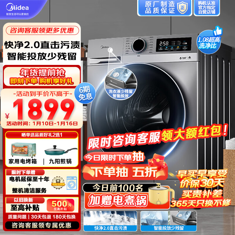 美的(Midea)滚筒洗衣机全自动10公斤家用大容量变频超薄滚筒 除菌除螨智能投放 以旧换新MG100Q35IY价格:1899.00元!