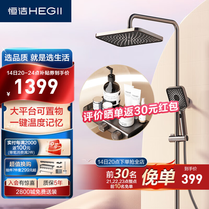 恒洁(HEGII)淋浴花洒套装 方形置物枪灰色增压除垢花洒全套HMF917-333D-SN价格:1399.00元!