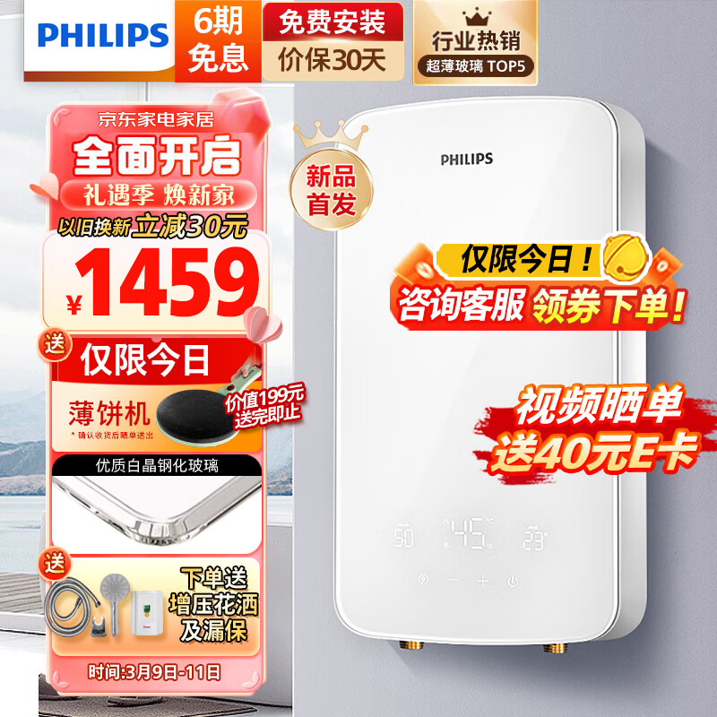 飞利浦(PHILIPS)即热式电热水器 液晶数显超白玻璃屏8500W速热无极变频Ai四季恒温免储水 淋浴洗澡AWH1061/93价格:1459.00元!